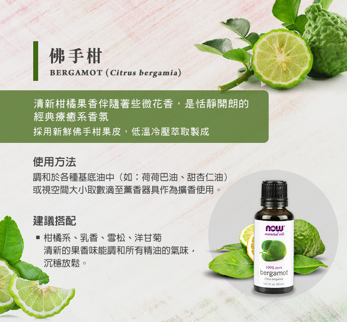 | 品名: | 【NOW】Bergamot Oil 佛手柑精油(30 ml) |