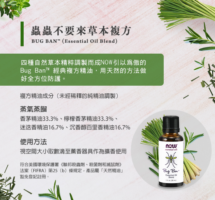 | 商品名稱 | NOW Bug Ban™ Essential Oil Blend 蟲蟲不要來草本複方精油(30 ml) |
