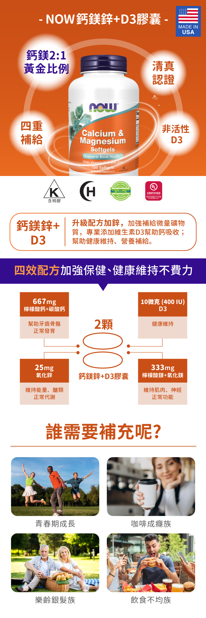 | 品名: | 【NOW】鈣鎂鋅+D3膠囊(120顆) |