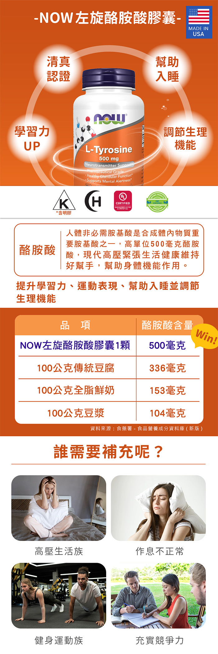 | 品名: | 【NOW】左旋酪胺酸膠囊1瓶(120顆) |