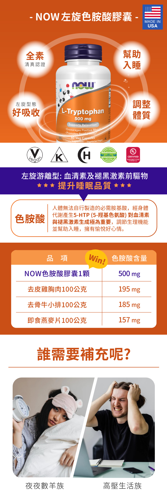 | 品名: | 【NOW】左旋色胺酸膠囊 |